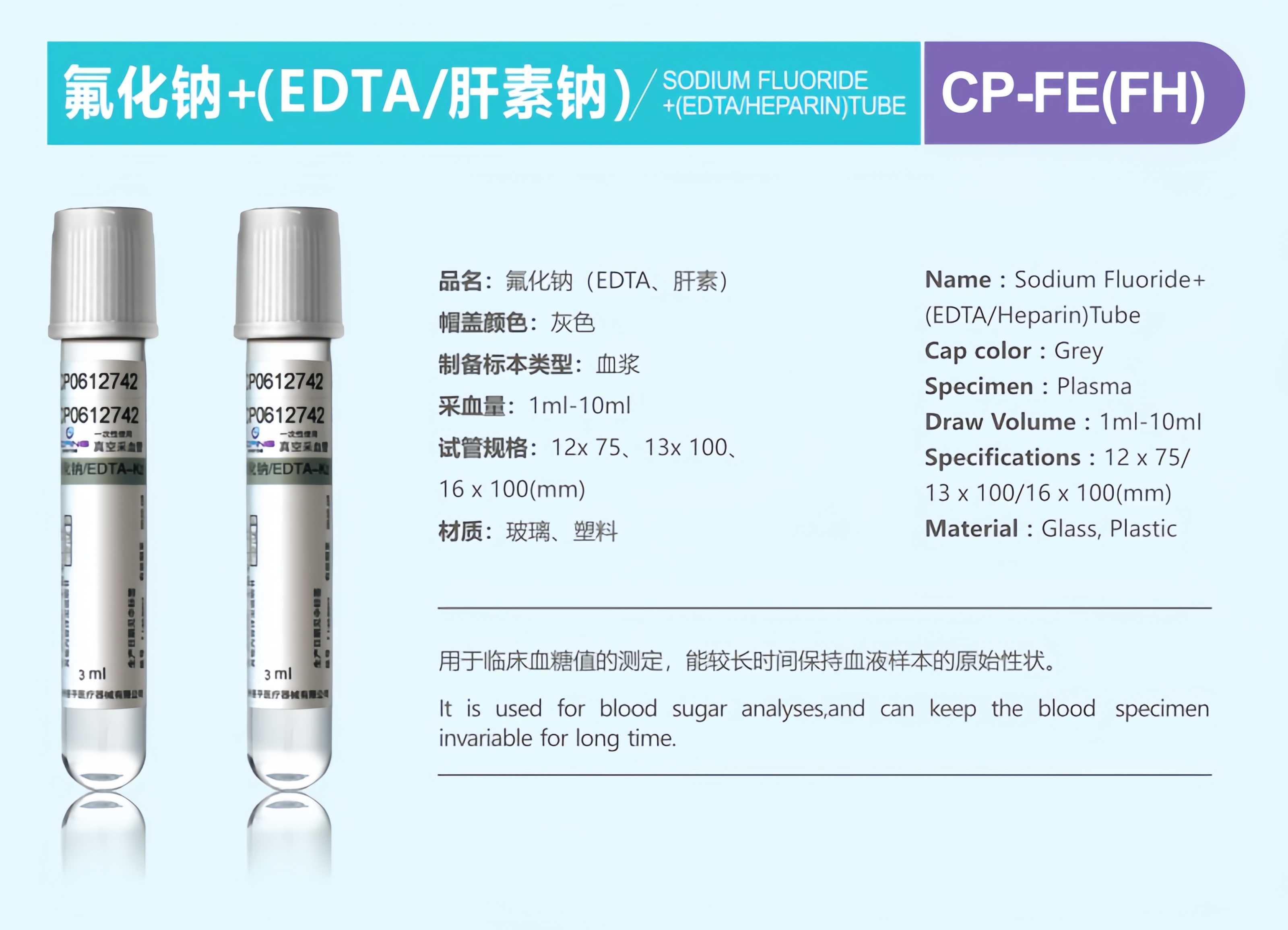 Sodium Fluoride+(EDTA/Heparin) Tube CP-FE(FH)